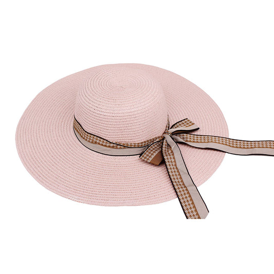 Houndstooth Ribbon Bow Straw Sun Hat